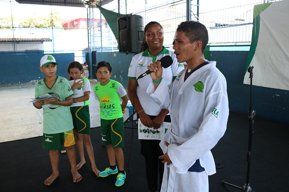 Erimara, moradora da comunidade, e mãe do adolescente João Messias de 12 anos, falou da importância das ações do projeto para a vida do filho, que é autista e participou da modalidade Taekwondo “O professor acolheu ele no modo inclusão, e tem um ano que ele quis participar e eu achei interessante pra ele interagir com os outros coleguinhas, e foi uma surpresa pra mim porque ele gostou muito de participar”. Destaca Erimara.
