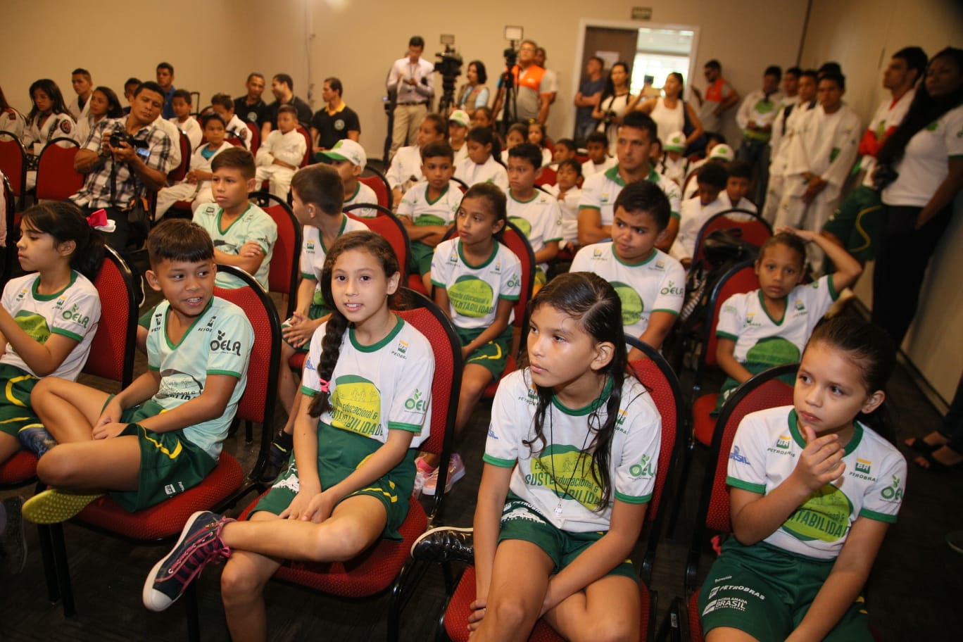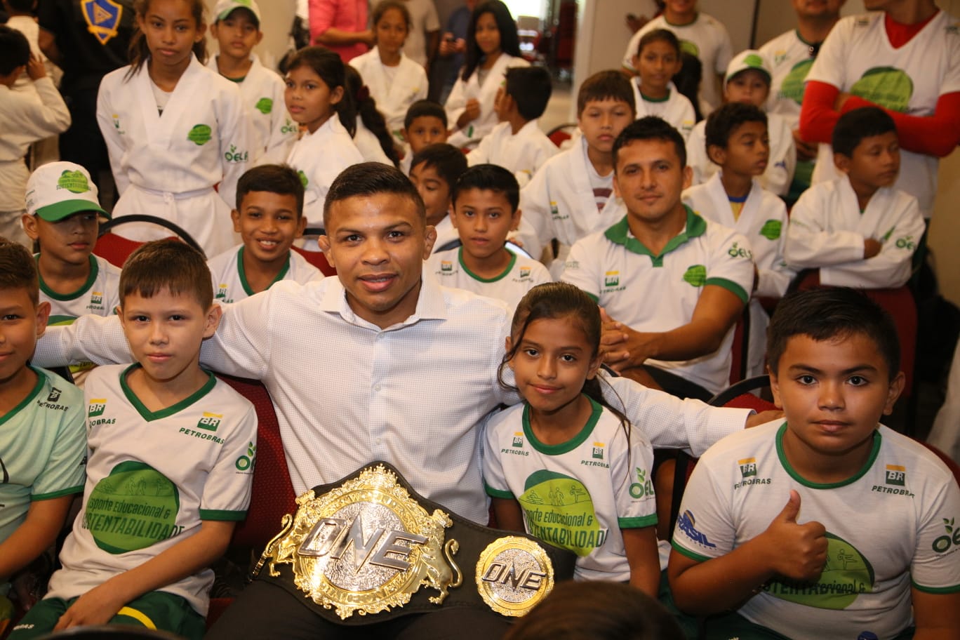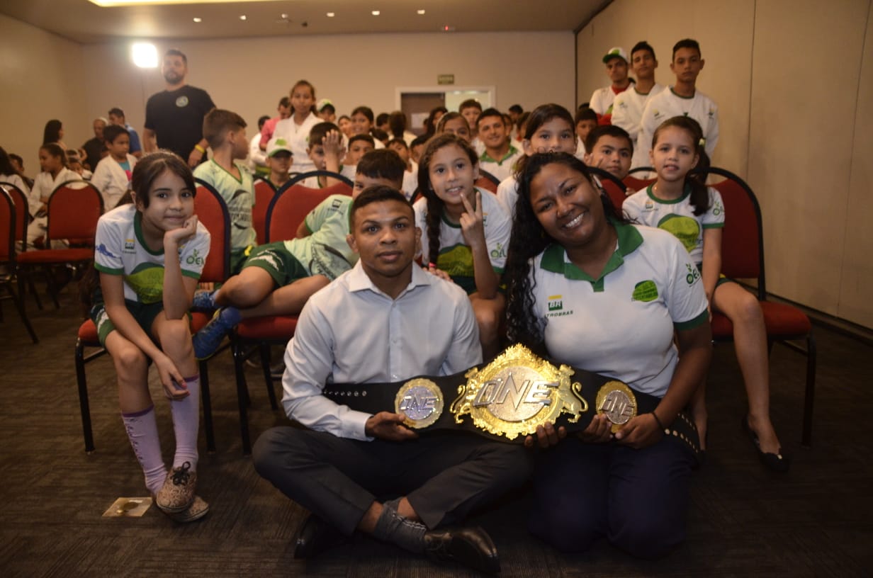 Na manhã desta terça-feira (19), os alunos do projeto Esporte Educacional e Sustentabilidade (EES), da Oficina Escola de Lutheria da Amazônia (OELA) prestigiaram a coletiva de imprensa do campeão de MMA e amazonense Bibiano Fernandes, o “The Flash”.